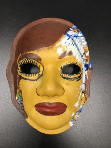 “Hard to articulate the complexities of a brain injury with blank spaces in my head, trying to remember how to spell certain words & remember details yet foggy-strange because I’m a writer with mismatched brain waves, words read backwards & where I know how to pronounce the words, what starts @ beginning & end but what’s in-between? Kinda like life.. sometimes jumbled, stumbling with words, can’t’ get them out fast enough before I forget them & they fall to the ground. Days like this- art helps me process through and find meaning in the moment. I began sketching dress designs & ceramics in this & this is my 1st attempt at mask art. Struggle(d) with words & numbers, couldn’t deal with forms & logic, but I could deal with tones & color, lines & spaces & it be fun to change my perspective. My injury happened 2 weeks before my 24th birthday. Stroke Viral Encephalitis. Heart imbalance. Nerve damage. Trouble with eyes, hearing, so many things happened, spiraled out of control, legs & all- led to autoimmune disease (Lyme, some say MS). So chaotic and dark at first, like a snowstorm coming down. While I was @ the top of my game rain, sleep, snow muddled in this earthen vessel. This turmoil attacking me, whole memories from my mind, yes, moments, events, time & conversations as if they never happened. Empty space represents this & gray tone, cliff with levels, snow storm coming down, down, down. Trying to survive & press through moments; hard to mend when doctors shuffling me round like paper & my case still sitting in DC (16 years now). Waiting for change- gain endurance. Hitting rock bottom with bruises blurred in, flashbacks of abuse circulating the air, pressing in, adding weight to it all, smudged my vision, but a jewel is still there…can you see it?